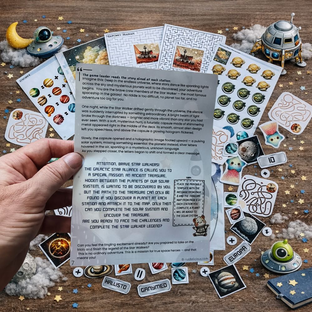 Kids become junior astronauts on the Star Wanderer mission, solving cosmic riddles and completing 8 fun station challenges (+ bonus tasks) while exploring the solar system. Perfect for birthdays, classrooms, or group activities for ages 4–9.