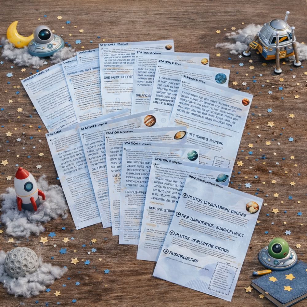 - Planet station cards: At each station, young astronauts discover a card that guides them through the solar system and gives important clues to help them solve the riddles.