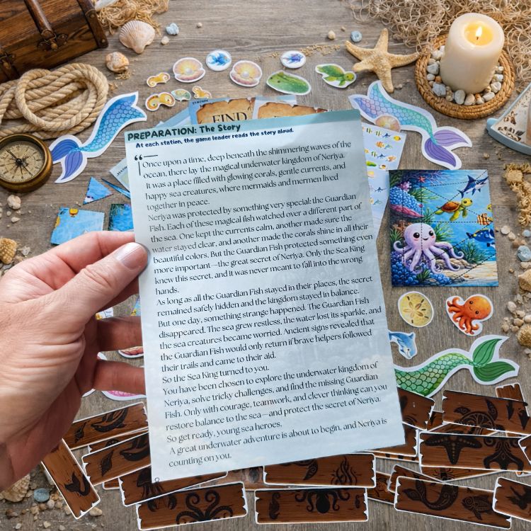 At each of the 8 beautifully illustrated stations, a new chapter of the story unfolds — taking kids through sparkling coral reefs, mysterious ocean labyrinths, and swirling deep-sea currents. With 4 optional bonus challenges, you can easily extend the adventure for older or more eager groups.