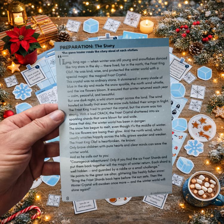 This Winter Scavenger Hunt turns every kids’ birthday party, holiday afternoon, or family outing into an exciting rescue mission through the icy world of Frost King Olaf. At each station, the game leader reads a chapter of the winter story — from secret frost hideouts and sparkling clues to small challenges that can only be mastered with courage, clever thinking, and teamwork.